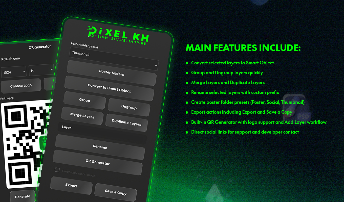 Pixelkh-Panel is a productivity plugin for Adobe Photoshop that speeds up repetitive layer and export tasks in one clean panel. It helps designers work faster with quick actions for Smart Objects, grouping, renaming, exporting, and QR generation while keeping projects organized.